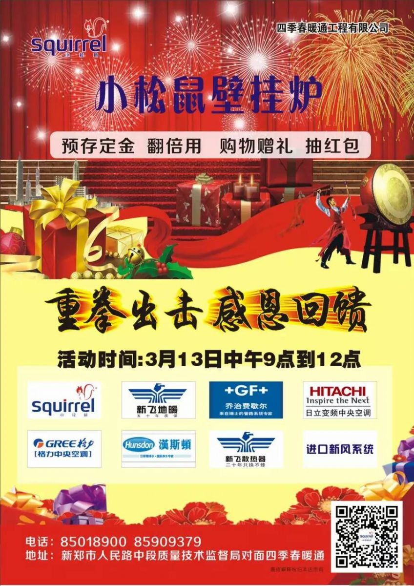 新飛散熱器、新飛地暖聯(lián)合國內(nèi)外**一線品牌,新鄭賈總借助3.15活動,重拳出擊,感恩回饋廣大消費(fèi)者,歡迎廣大消費(fèi)者進(jìn)店咨詢!