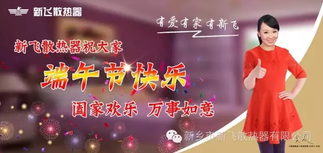 端午節和春節、中秋節一樣成為中國的代名詞,我們每一位新飛伙伴也是新飛散熱器自己的代言人,新飛散熱器有限公司董事長潘紹峰先生攜新飛全體員工祝愿新飛伙伴們生意紅火,端午快樂!