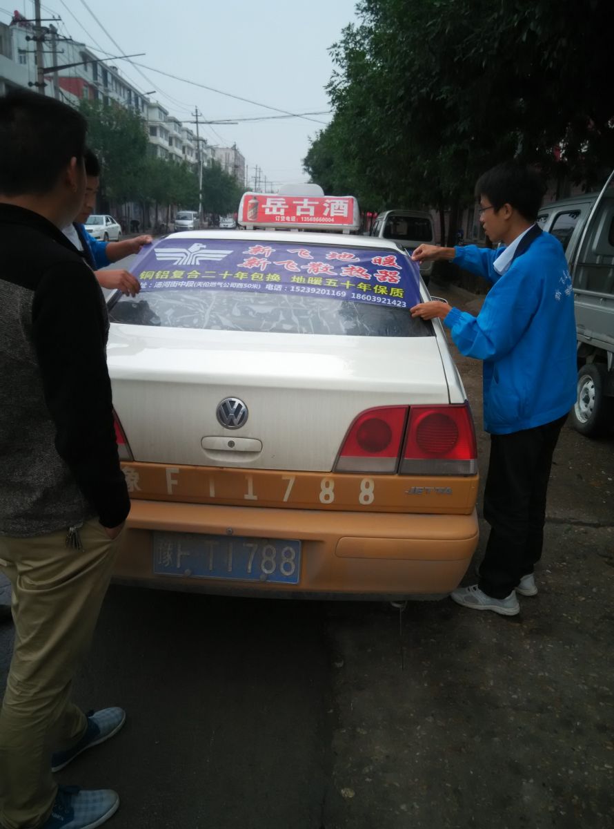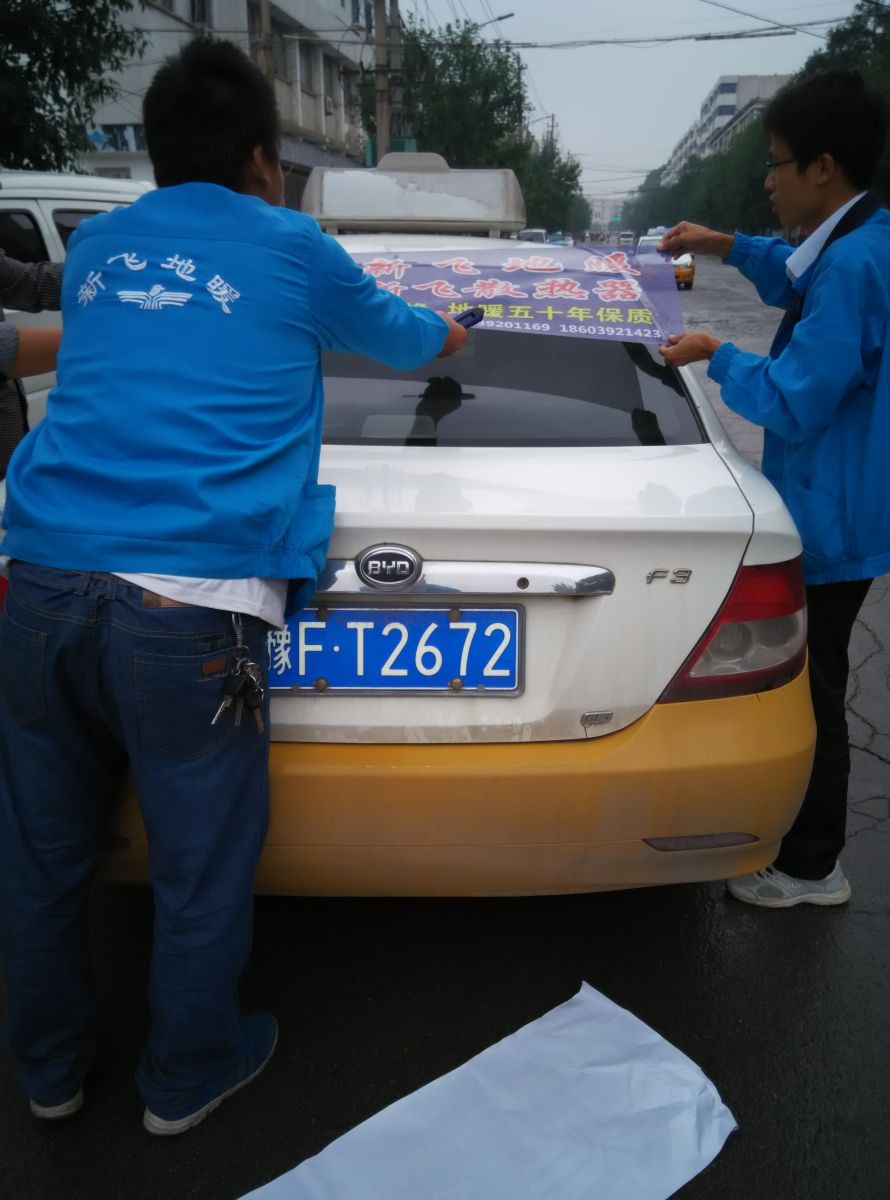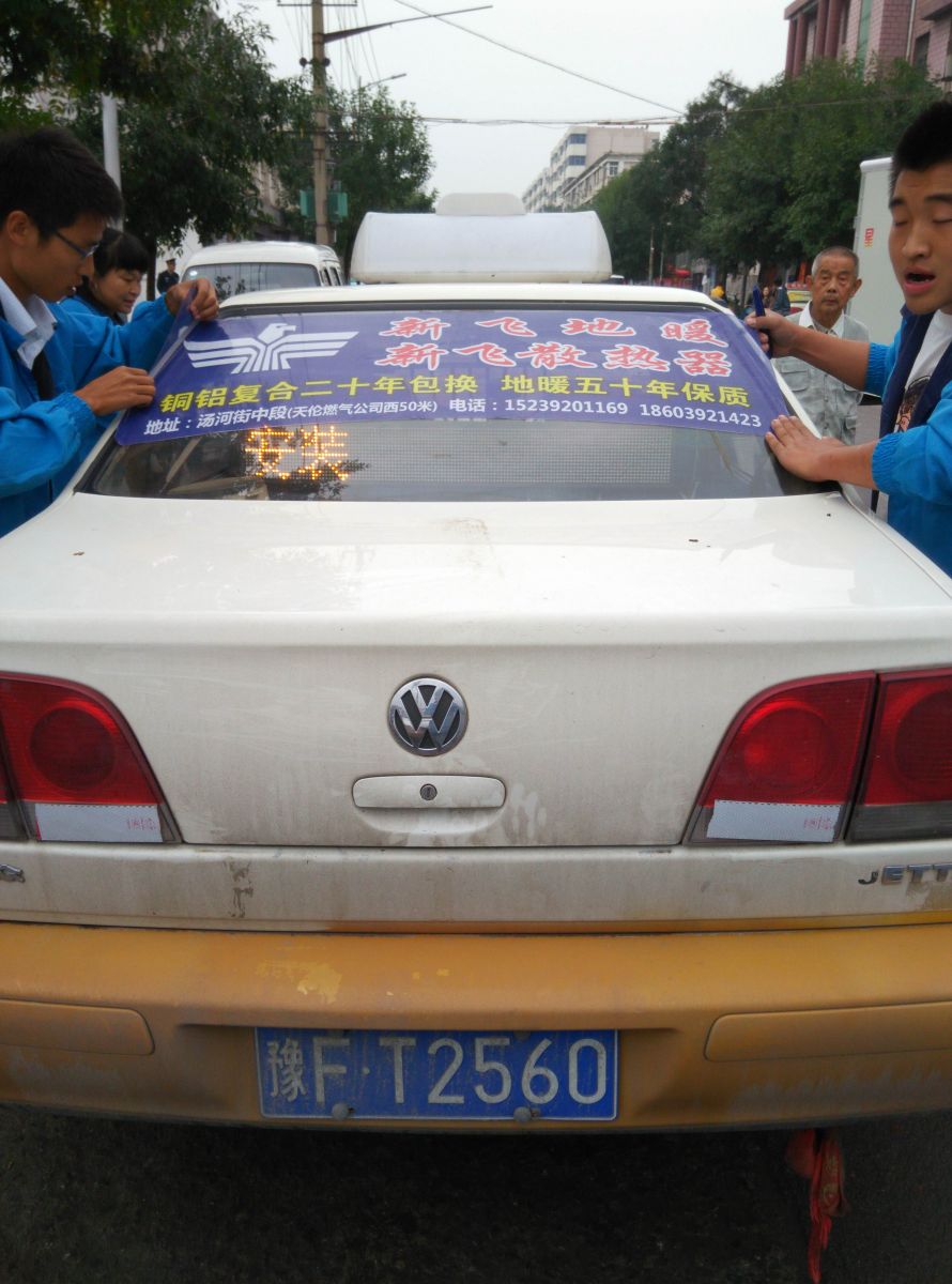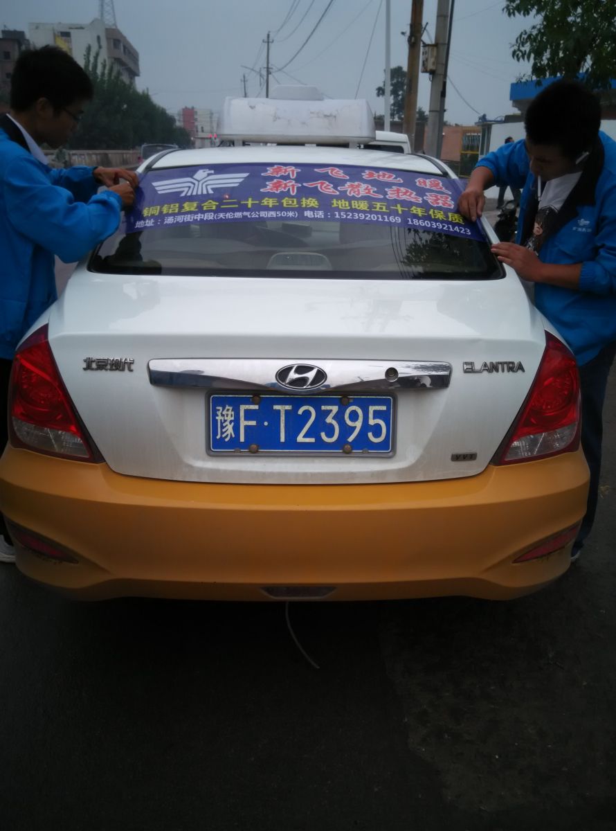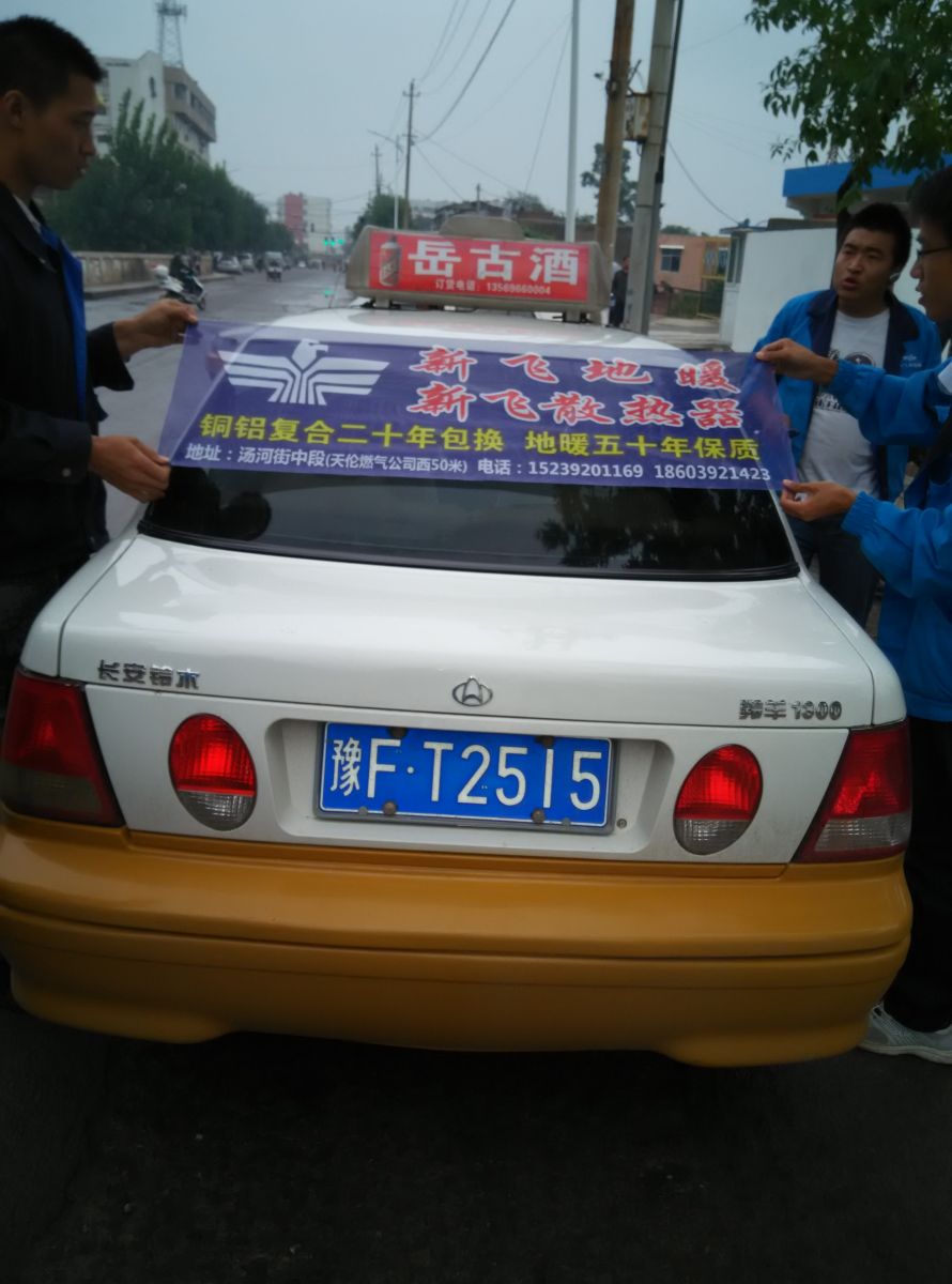 為響應新鄉市新飛散熱器有限公司十一優惠政策,鶴壁代理商王經理在全市舉行團購簽購會,買新飛散熱器抽新飛冰箱大獎,氣氛熱烈,轟動全城!為配合公司宣傳,特做百輛出租車廣告。