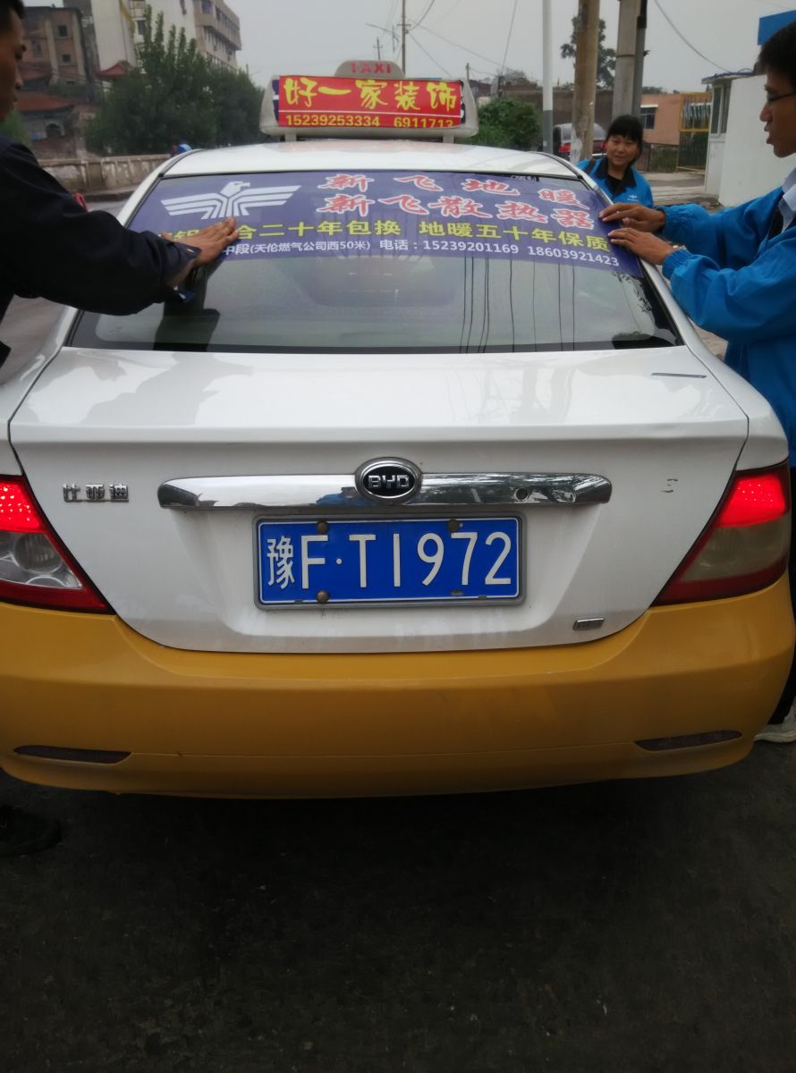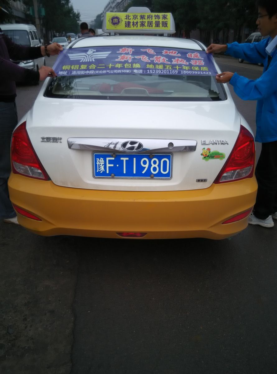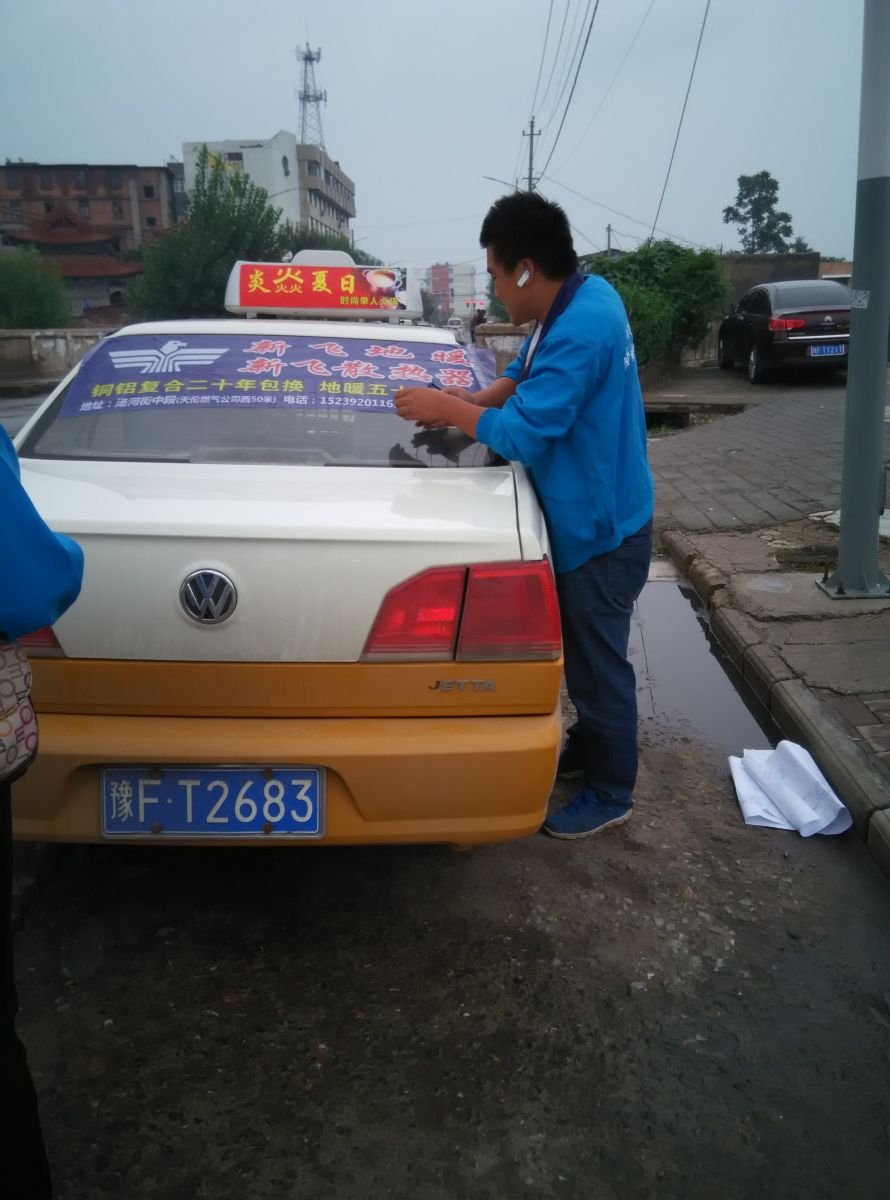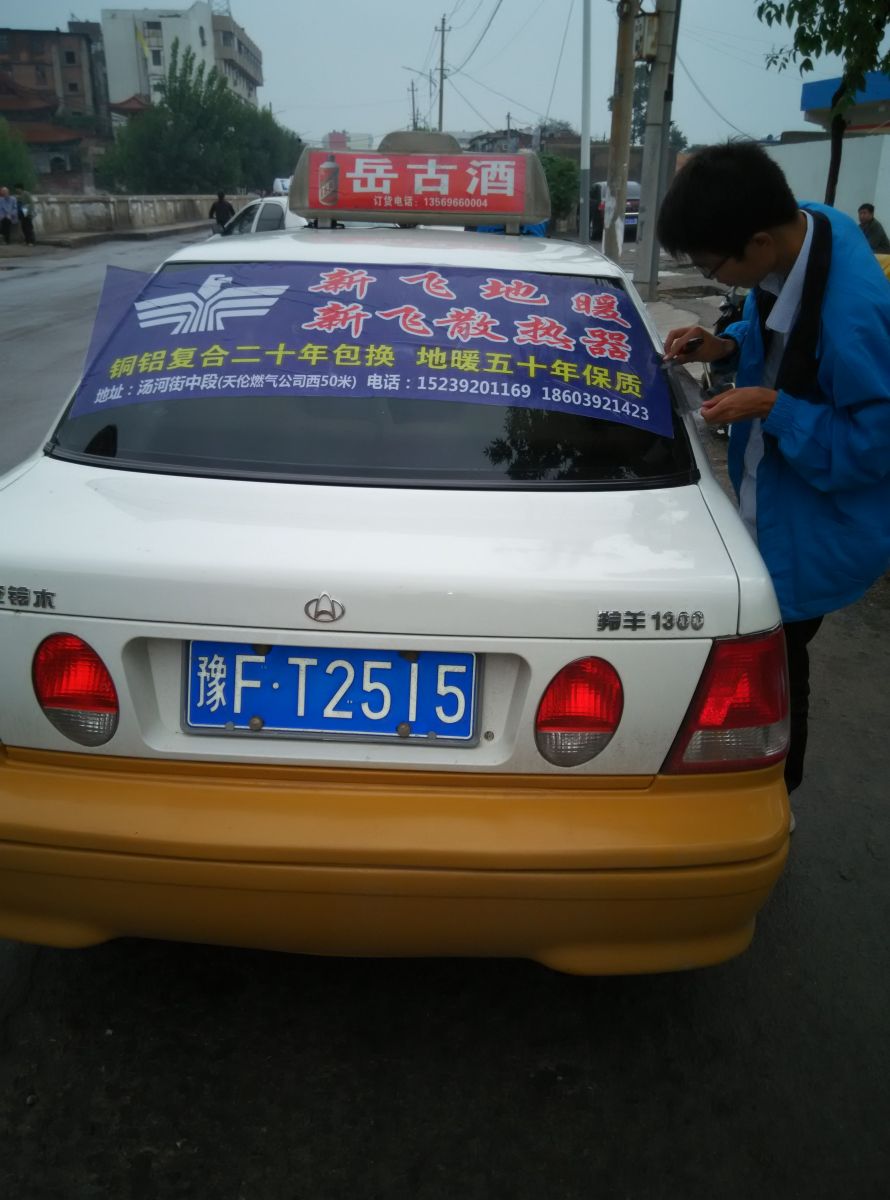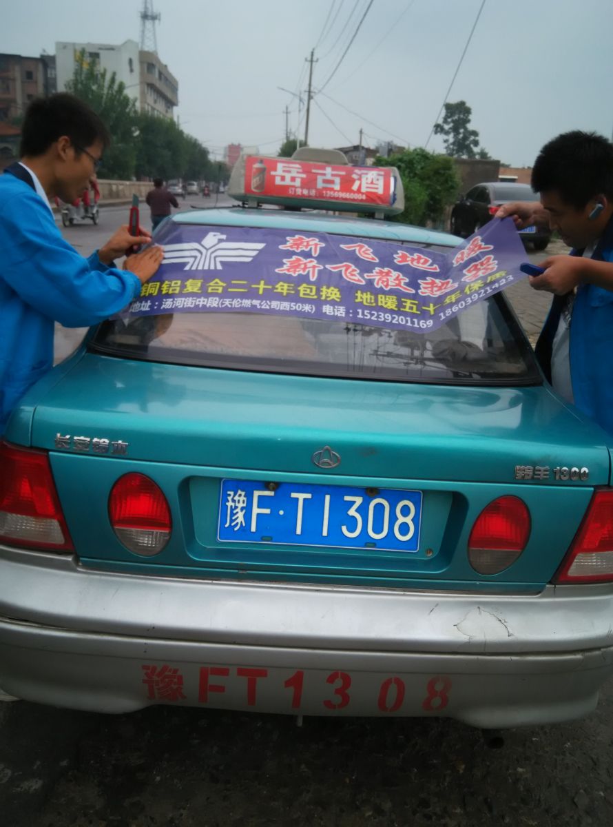 為響應新鄉市新飛散熱器有限公司十一優惠政策,鶴壁代理商王經理在全市舉行團購簽購會,買新飛散熱器抽新飛冰箱大獎,氣氛熱烈,轟動全城!為配合公司宣傳,特做百輛出租車廣告。