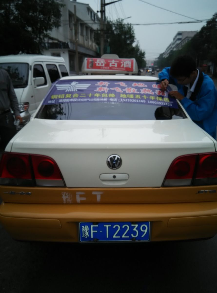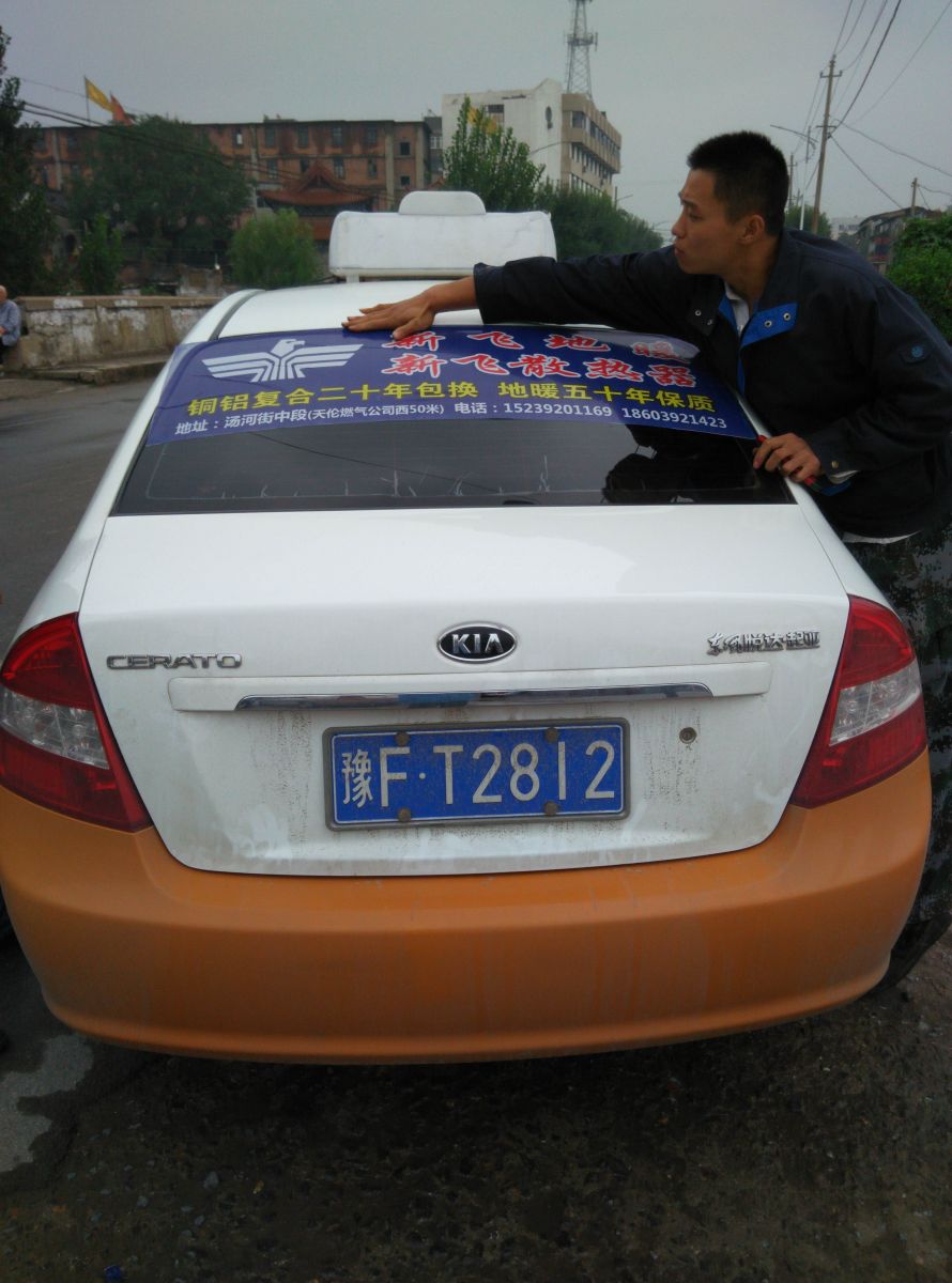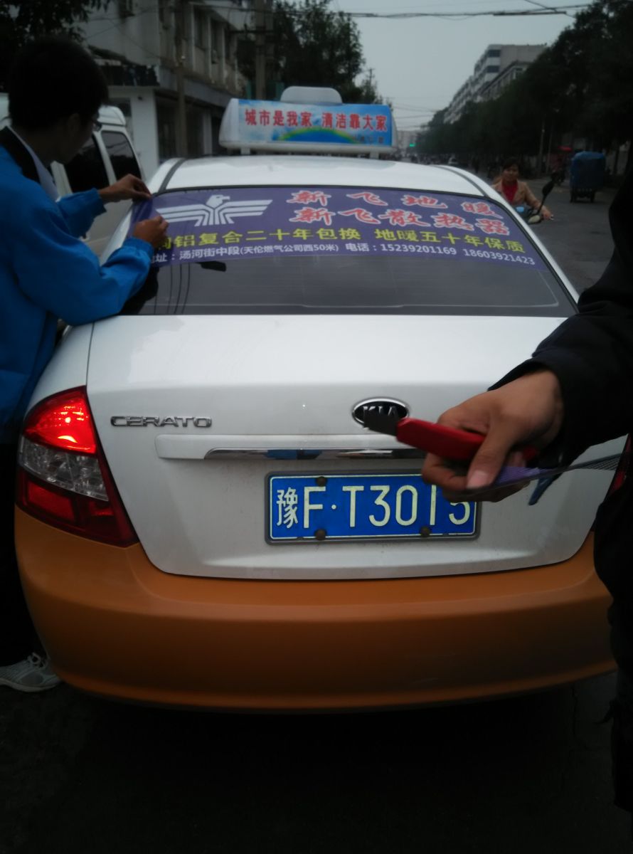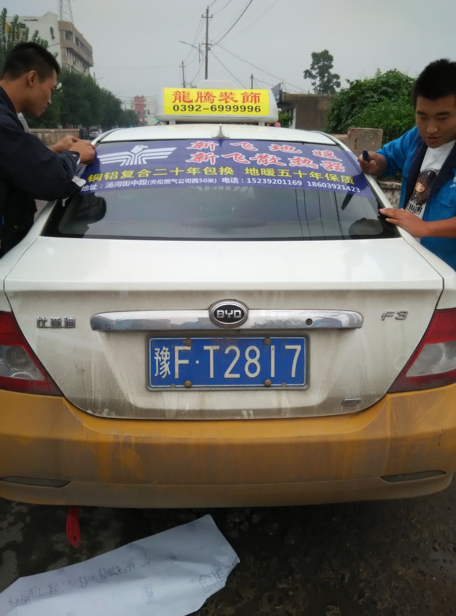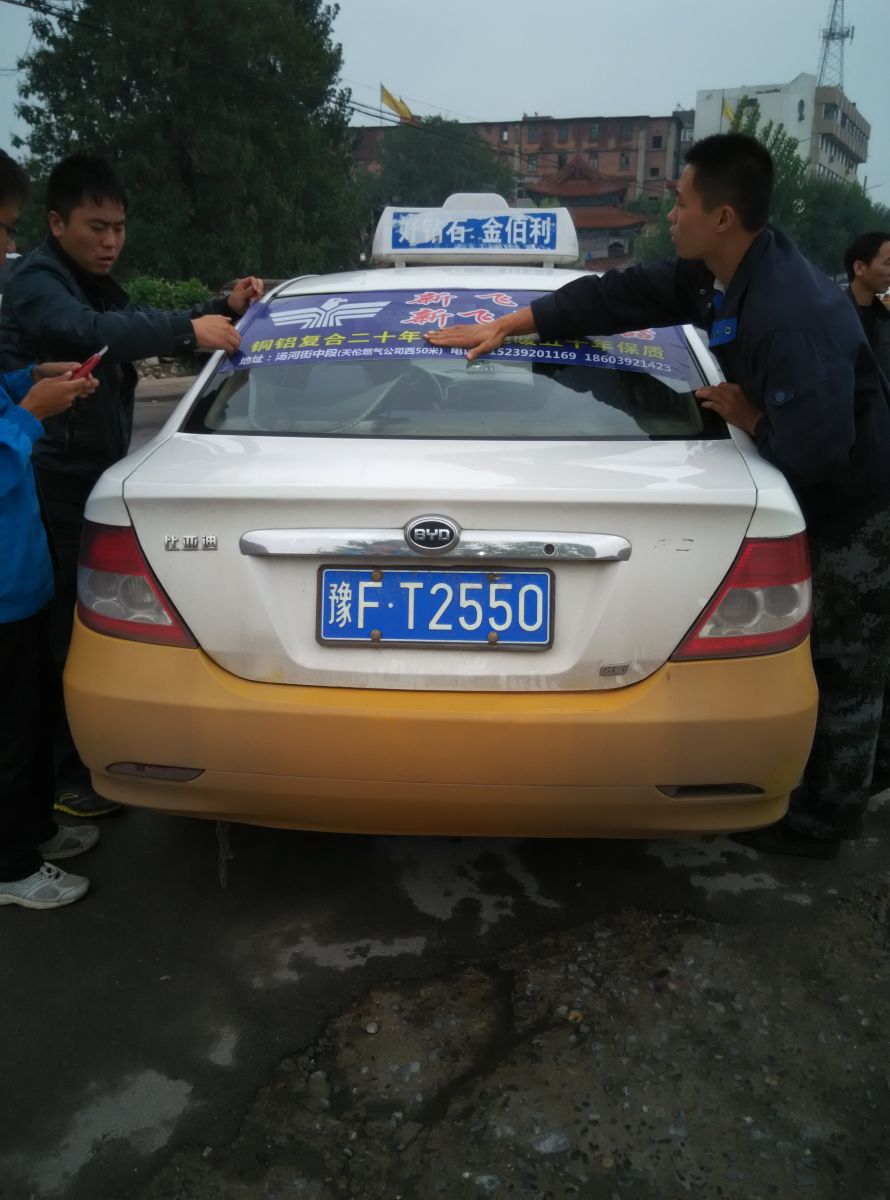 為響應新鄉市新飛散熱器有限公司十一優惠政策,鶴壁代理商王經理在全市舉行團購簽購會,買新飛散熱器抽新飛冰箱大獎,氣氛熱烈,轟動全城!為配合公司宣傳,特做百輛出租車廣告。